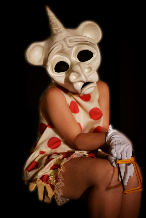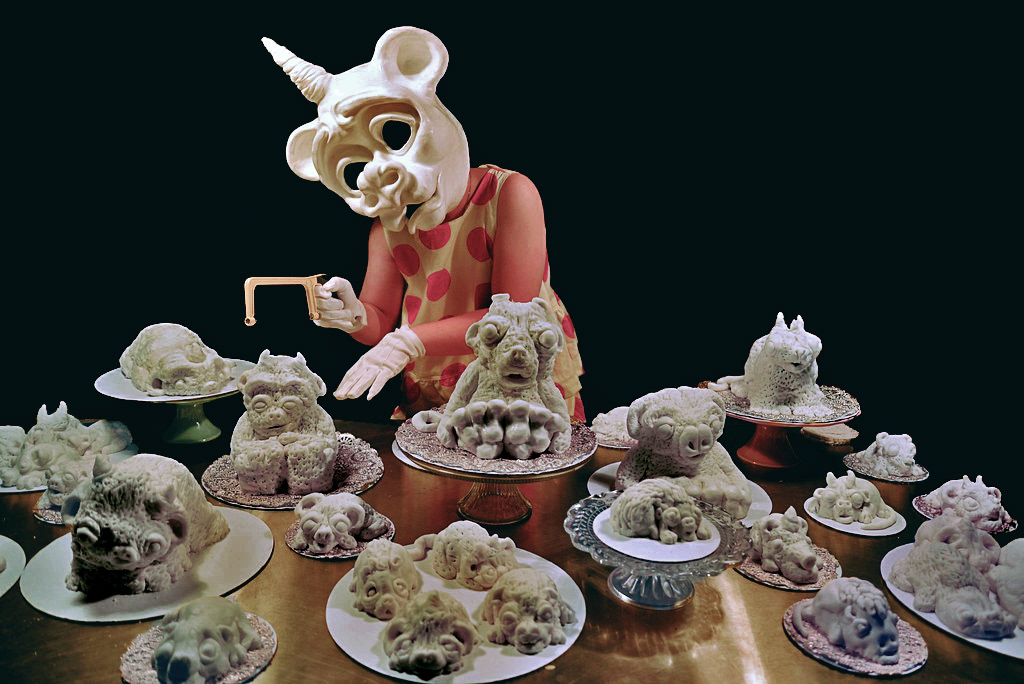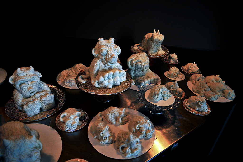 Photographs of Durational Performance (May 27-29 2015) Artist sat in character in the gallery as a monster for 3 days, sacrificing and then serving smaller monsters (made of cake) to viewers as they were let into the gallery space one-by-one